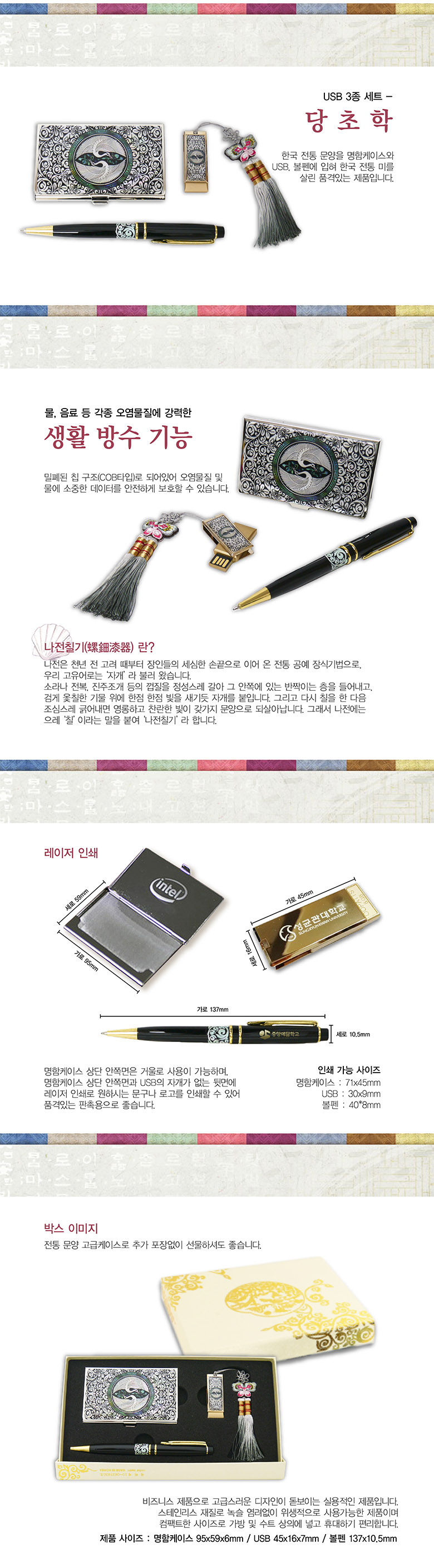 | 제품규격 | 볼펜:137x10.5mm / USB메모리:40x16x7mm / 명함케이스:95x59x6mm |